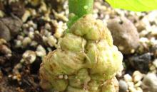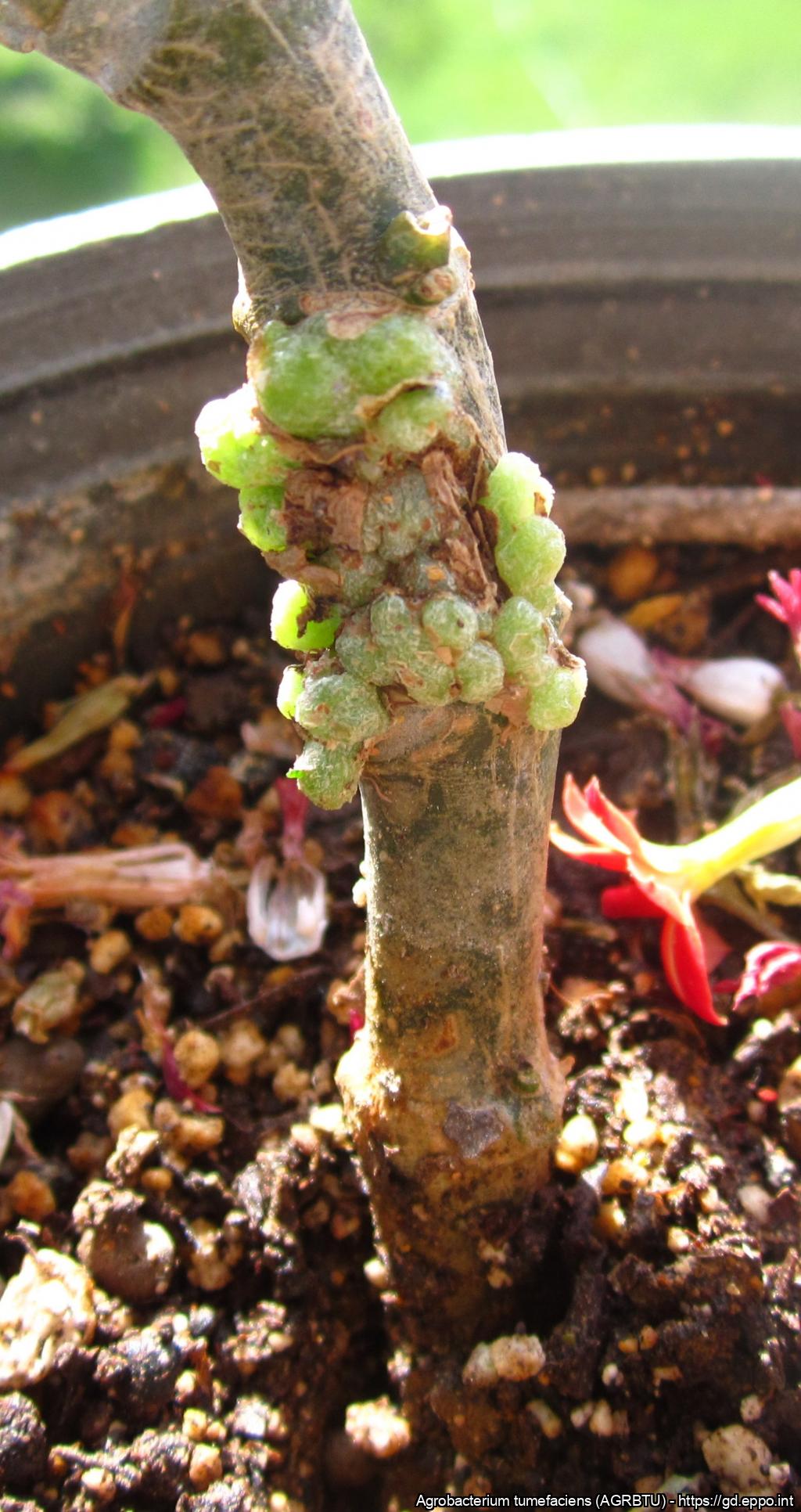 Crown gall disease symptoms caused by Agrobacterium tumefaciens on artificially inoculated Christmas kalanchoe plant 40 days post inoculation.