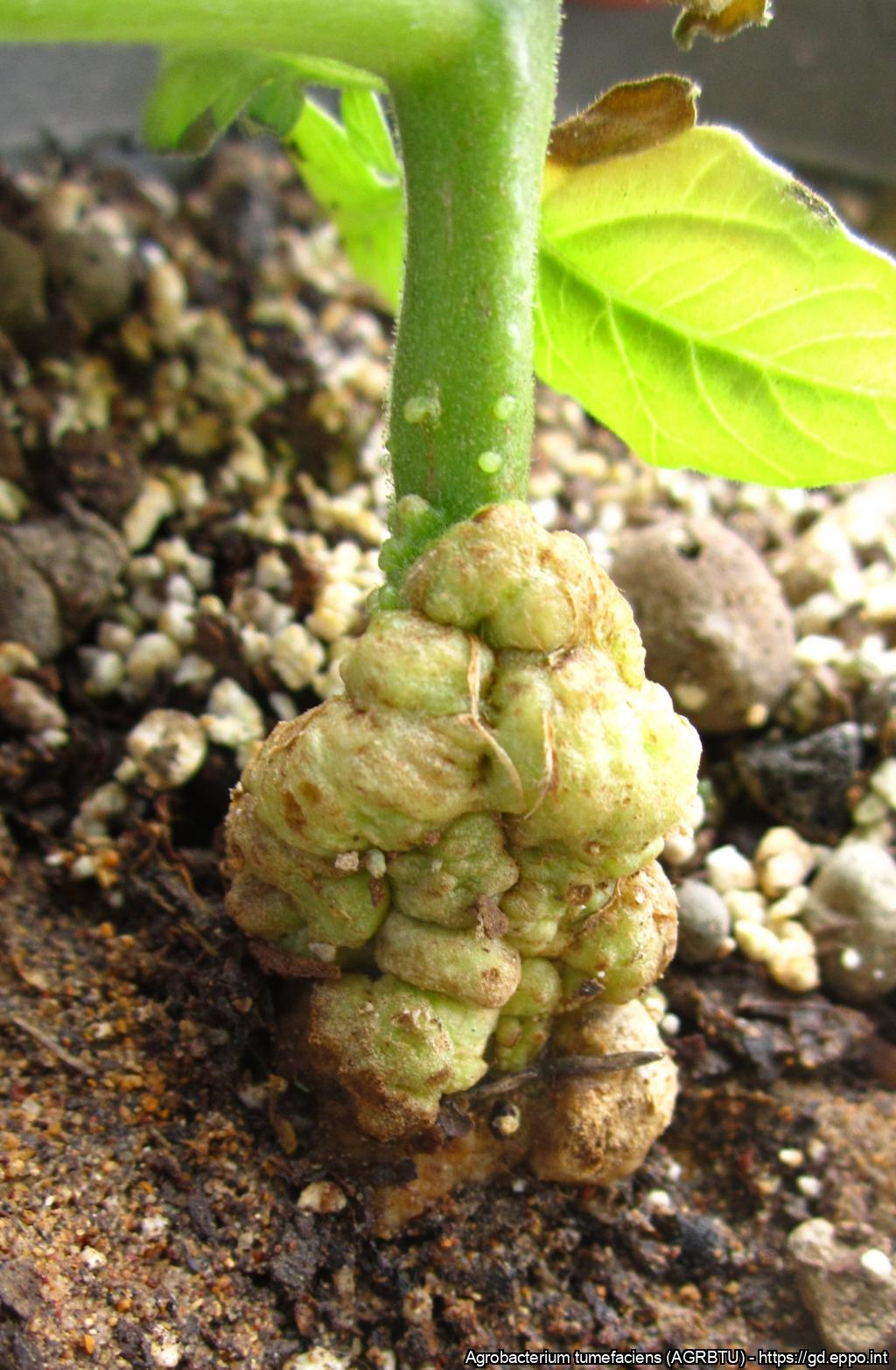 Crown gall disease symptoms caused by Agrobacterium tumefaciens on artificially inoculated tomato plant 20 days post inoculation.
