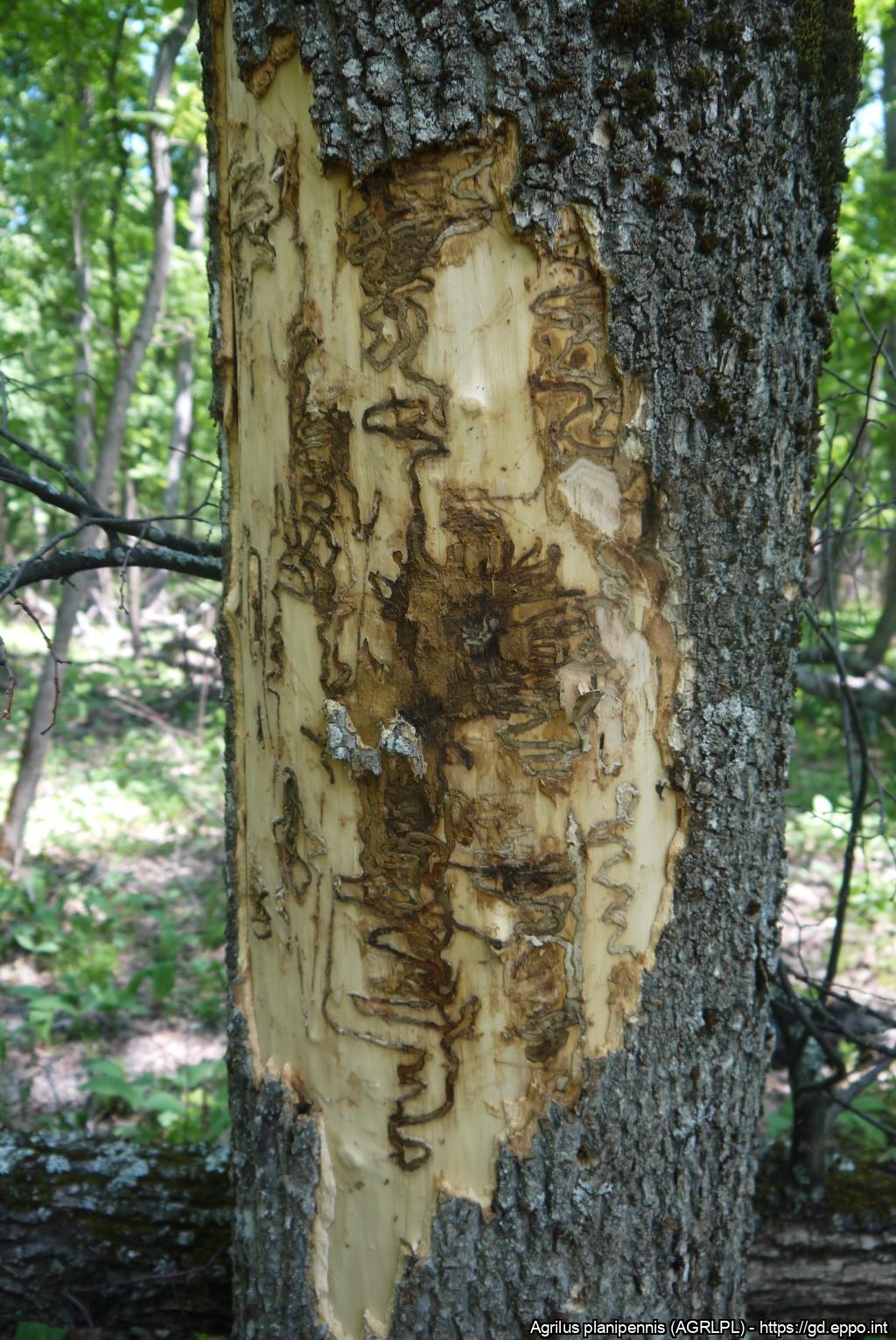 Larval S-shaped, frass-filled tunnels are visible on inner bark and outer sapwood
