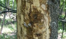 An European ash (Fraxinus exscelsior) with galleries of A. planipennis, Borisoglebsk, Voronezh Region of Russia, 2025.