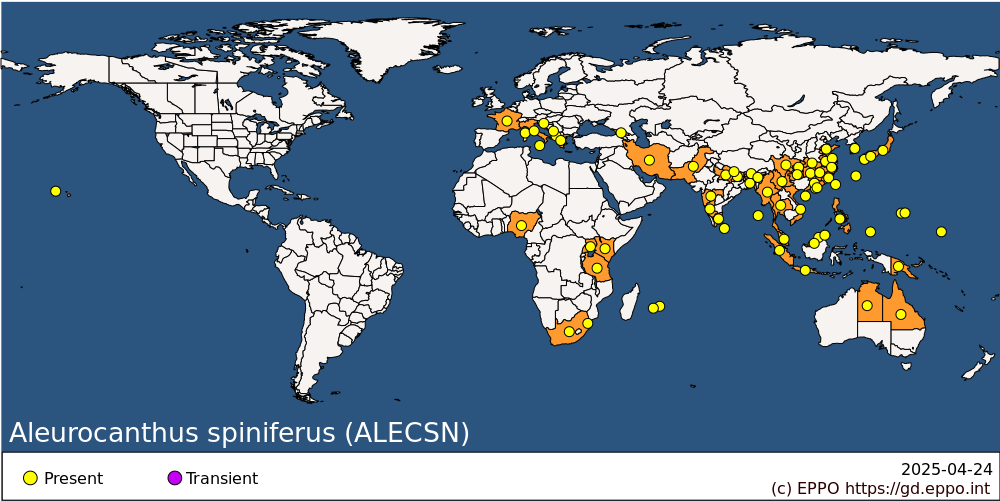 Aleurocanthus spiniferus grouped two different taxa for several years, until the description of Aleurocanthus camelliae was published (Kanmiya et al., 2011). Records of A. spiniferus prior to 2011 may include records of A. camelliae, especially for populations infesting tea (Camellia sinensis).