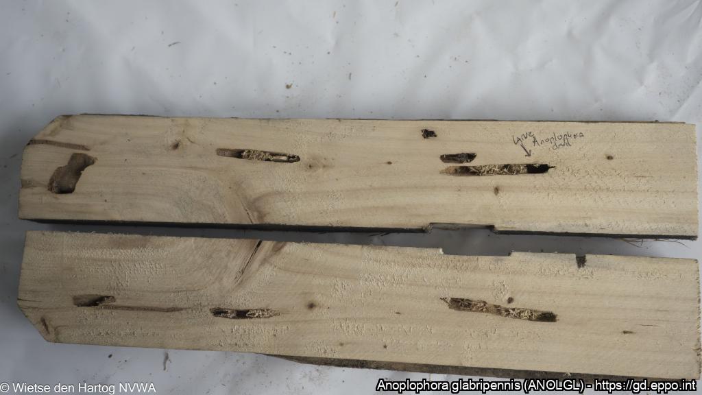 Feeding of the larva of Anoplophora glabripennis under the bark.