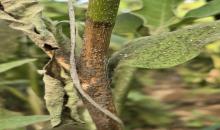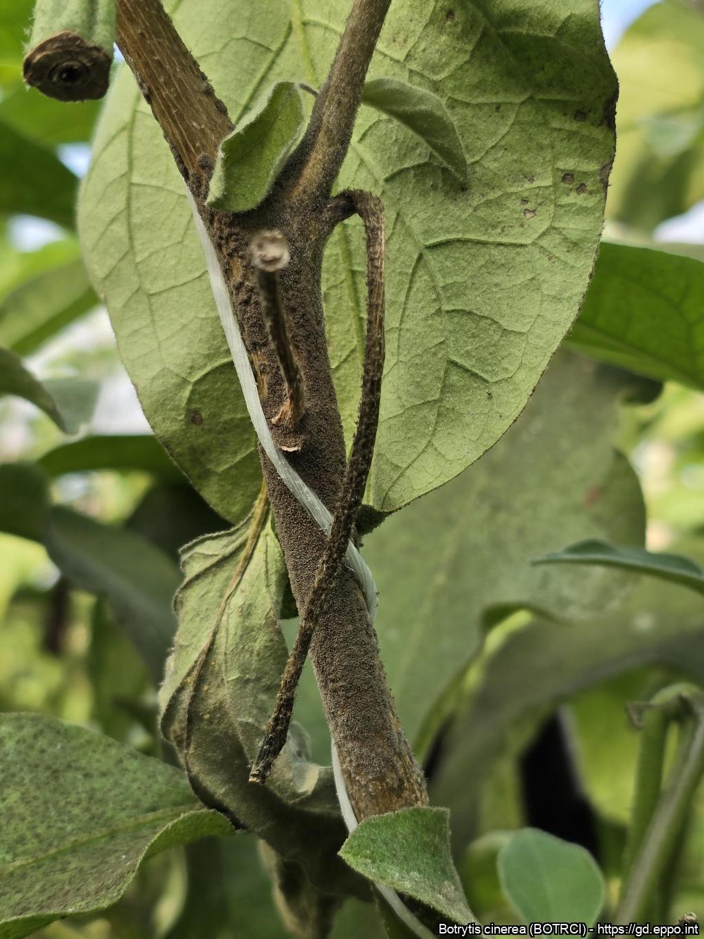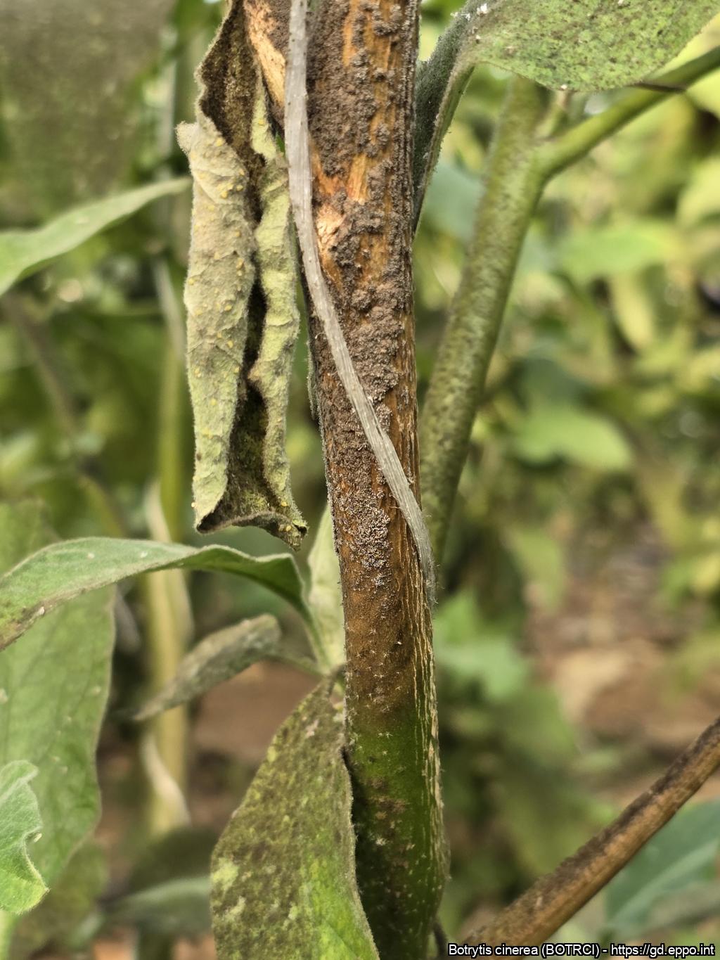 Stem infection of Botrytis cinerea on a tomato plant