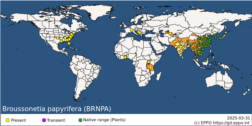 The distribution map includes countries where the species is native or present in the natural environment. The map does not include countries where the species is only known to be planted.