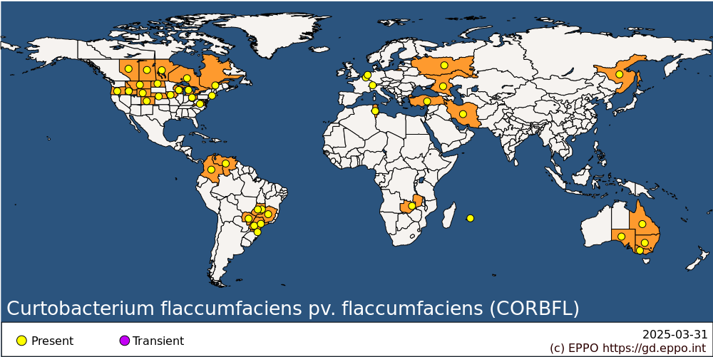 This distribution map covers bacterial wilt of Fabaceae. Research in taxonomy (2024) showed that bacterial wilt of Fabaceae is caused by 3 species Curtobacterium flaccumfaciens pv. flaccumfaciens, Curtobacterium poinsettiae pv. fabae and Curtobacterium aurantiacum. Maps for Curtobacterium poinsettiae and Curtobacterium aurantiacum are also available.