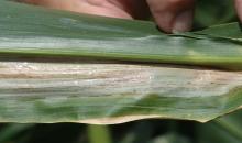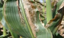 Goss's blight shiny exsudate on maize leaf