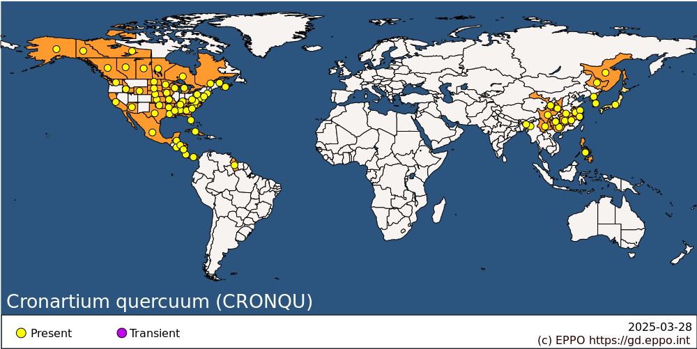 Taxonomic changes and difficulties in delimiting Cronartium species boundaries have introduced uncertainties on their geographical distributions. The distribution below belongs to Cronartium quercuum sensu lato. In particular, it is probable that records of C. quercuum in Asia correspond to other Cronartium species (e.g. C. orientale).