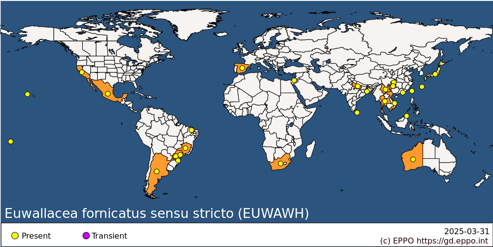 As Fusarium euwallaceae and its vector Euwallacea fornicatus sensu stricto are obligate symbionts, their distributions are identical.