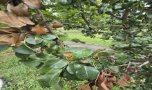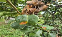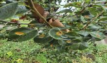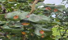 Aecia of Gymnosporangium sabinae on the lower leaf surface of pear