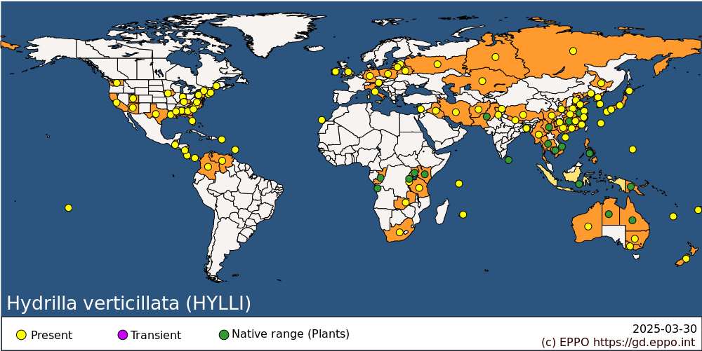 The native distribution of Hydrilla includes Asia, the NE part of Australia, and probably Central Africa (Cook & Lüönd, 1982). * Cook CDK, Lüönd R (1982) A revision of the genus Hydrilla (Hydrocharitaceae). Aquatic Botany, 13, 485–504.