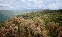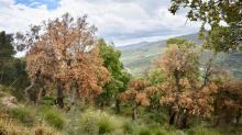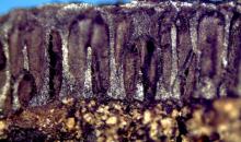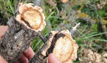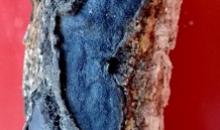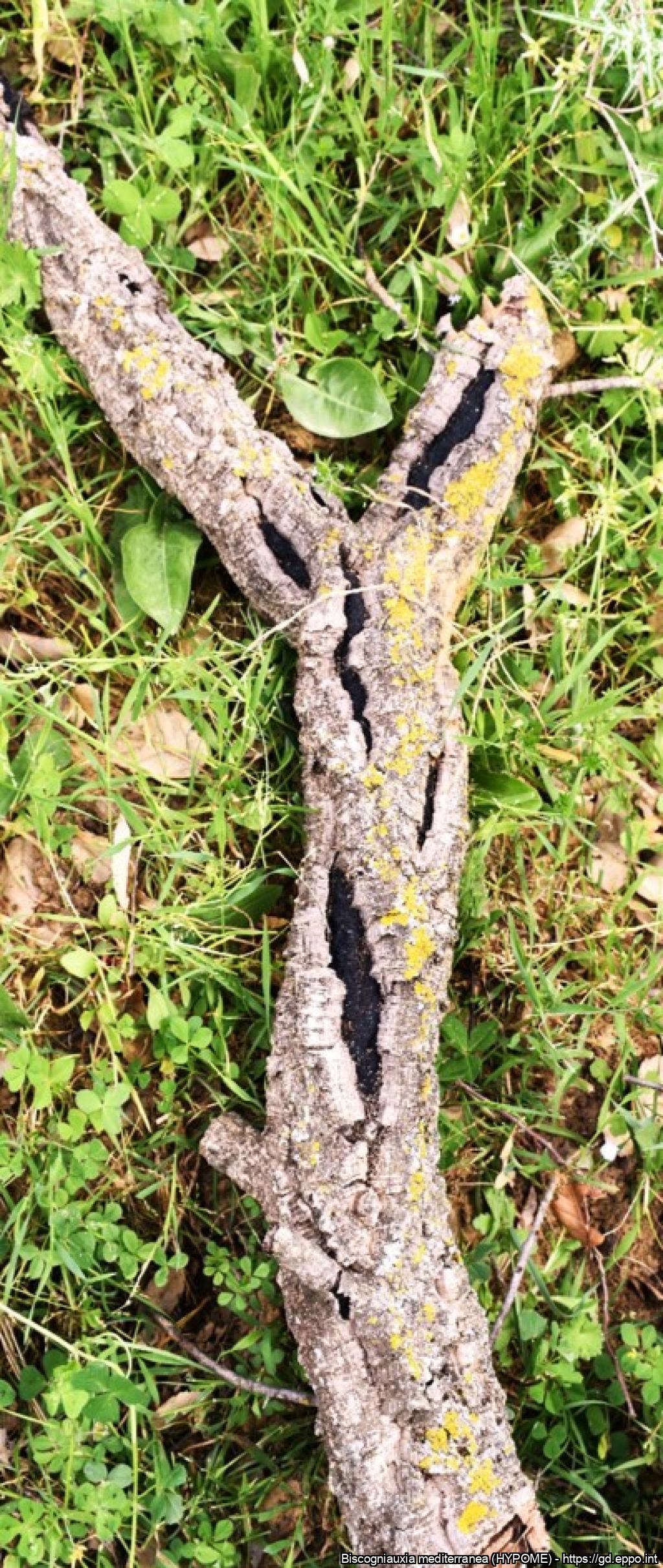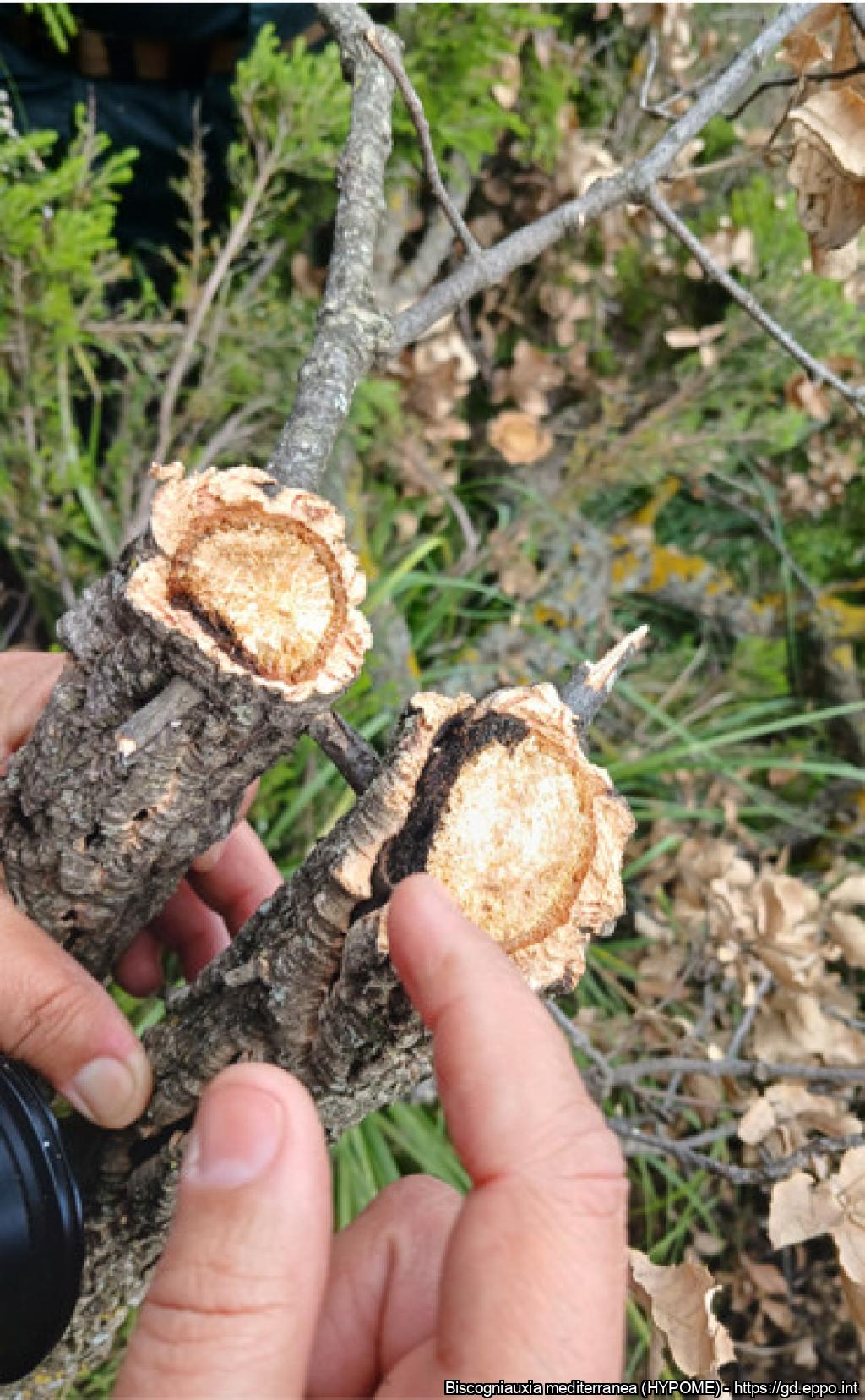 Cross section of a cork oak branch illustrating colonization of the cambial tissues by Biscogniauxia mediterranea, leading to blackening of the affected tissues.