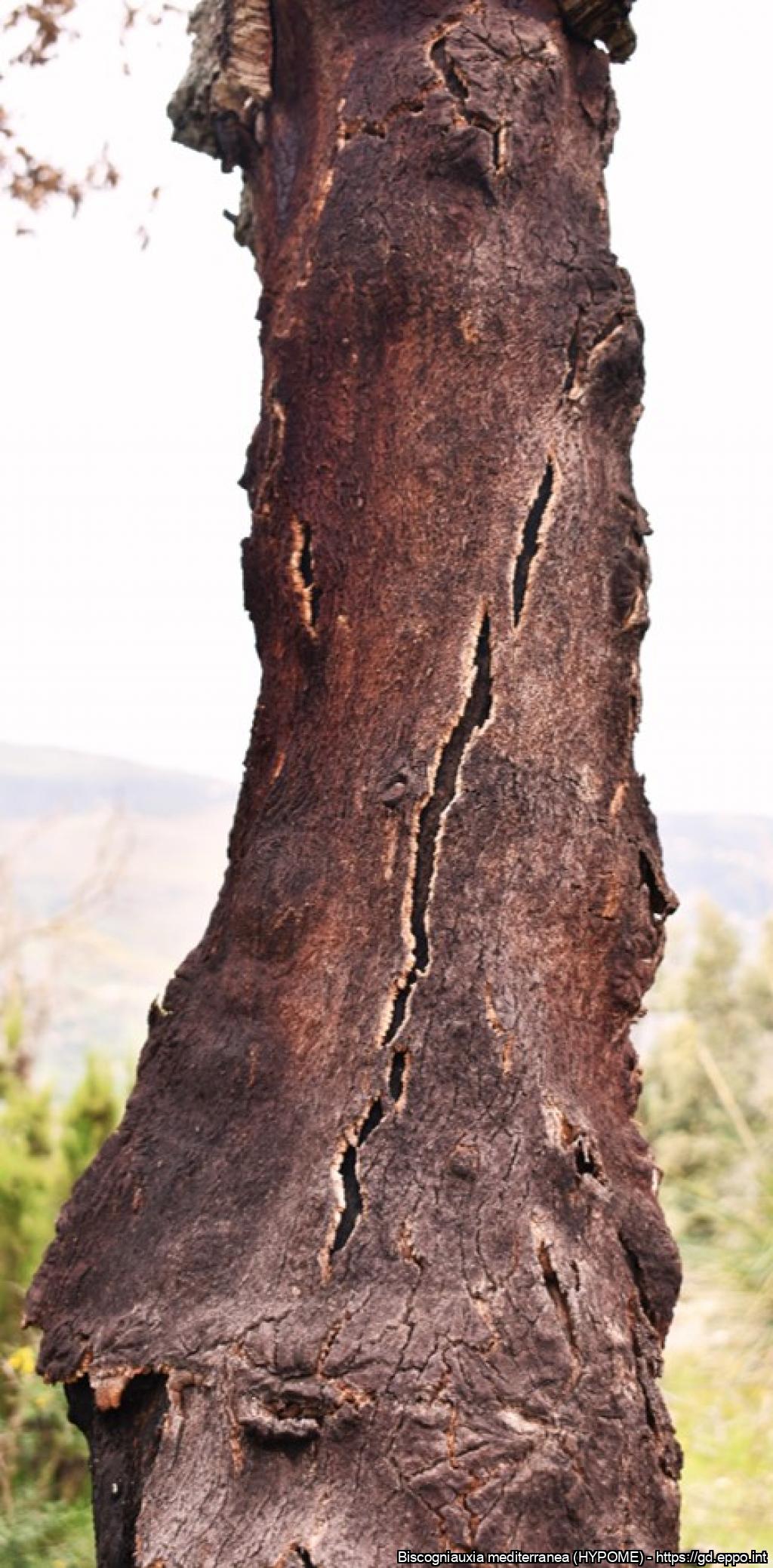 Longitudinal fissures on cork oak trunks associated with black discoloration of the underlying tissues.