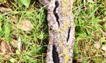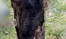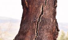 Longitudinal bark cracks on a branche revealing black, carbonaceous tissues beneath.