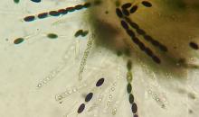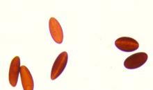 Ascospores are brown, ellipsoid to inequilateral, often appearing coffee bean–shaped with a distinct central groove