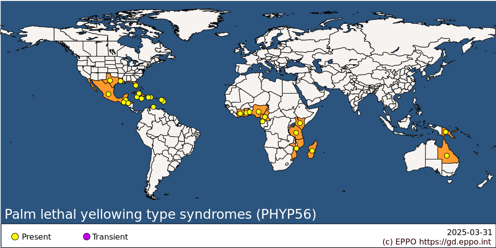 This distribution map covers palm lethal yellowing type syndroms that were first described for Palm lethal yellowing phytoplasma, as well as for 'Candidatus Phytoplasma aculeata' ,‘Candidatus Phytoplasma cocostanzaniae’, ‘Candidatus Phytoplasma dypsidis', ‘'CandidatusPhytoplasma hispanola', Candidatus Phytoplasma palmae’, ‘Candidatus Phytoplasma palmicola’, 'Candidatus Phytoplasma noviguineense'. Maps for each species are available.