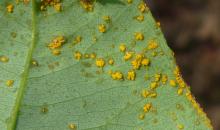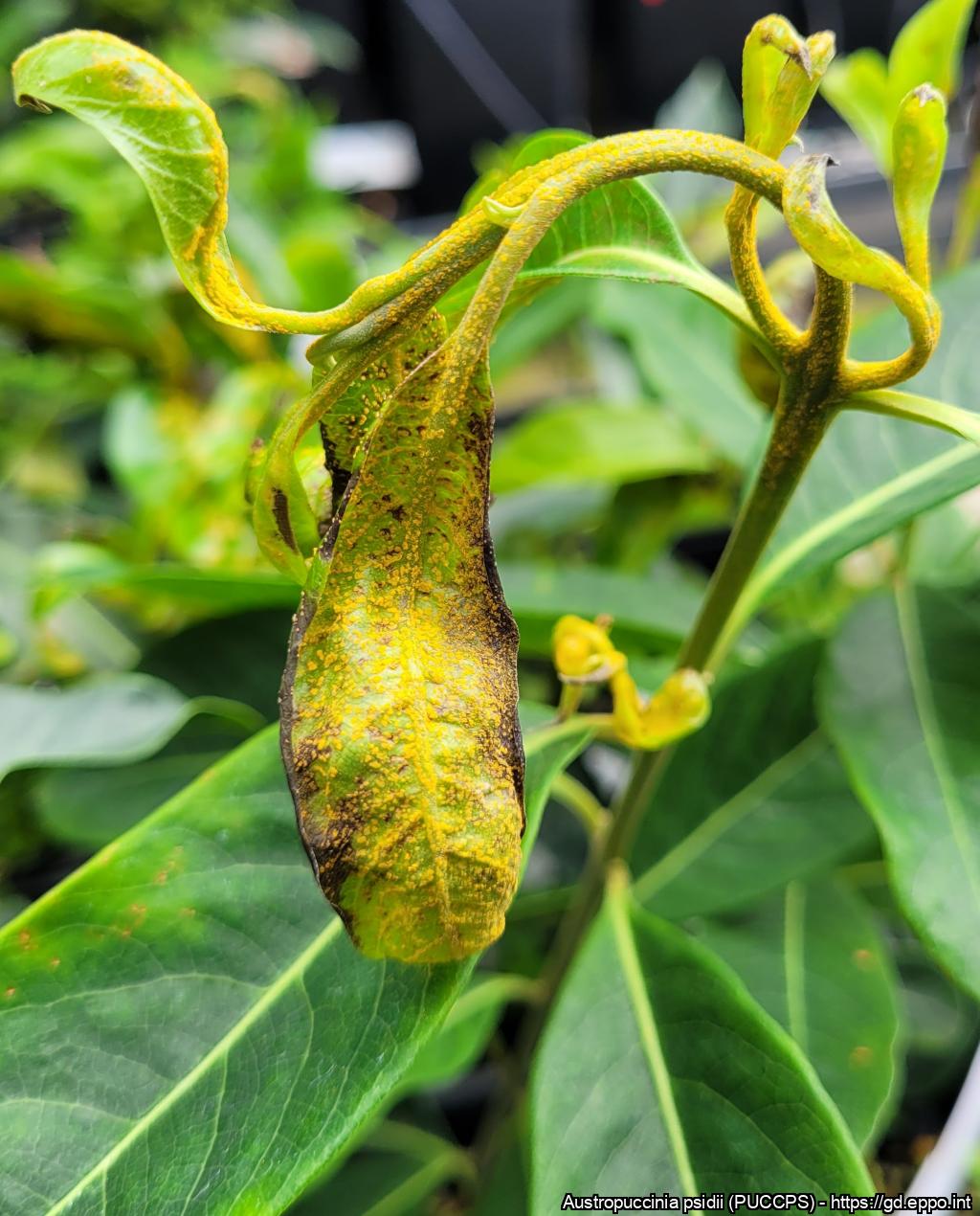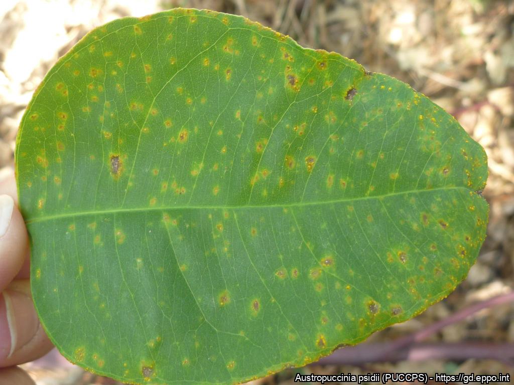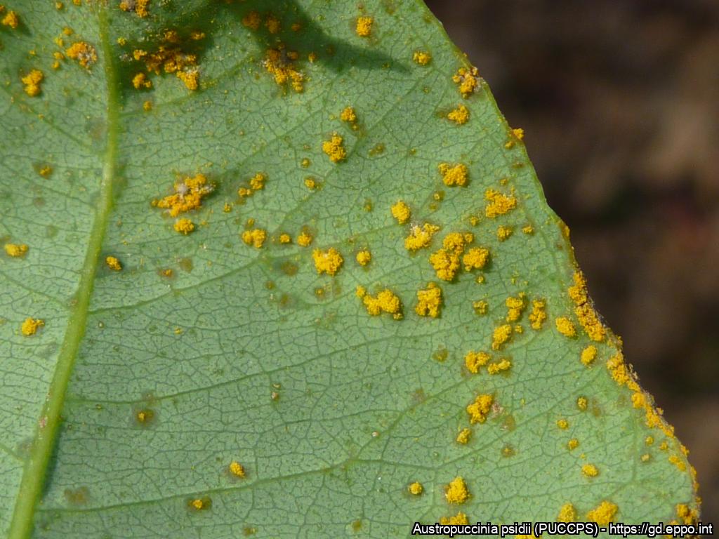 Austropuccinia psidii from Taiwan: telia (brown) and uredinia (yellow) on abaxial leaf side of Rhodomyrtus tomentosa