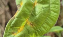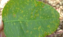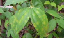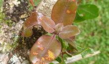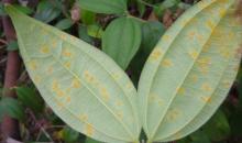 Upper surface of Rhodamnia rubescens; note chlorotic spots with very few uredinia.