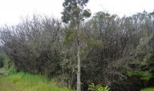 Metrosideros polymorpha coppice in Hawaii infected with Austropuccinia psidii.