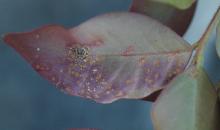 Austropuccinia psidii on Decaspermum humile. Final remaining leaves on a small tree dying from myrtle rust, Queensland, Australia
