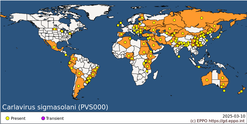 The distribution below covers all isolates, and not only non-European isolates. For details on non-European isolates, see EFSA (2020) Scientific Opinion on the pest categorisation of potato virus S (non-EU isolates). EFSA Journal 18(1), 5855. 38 pp.