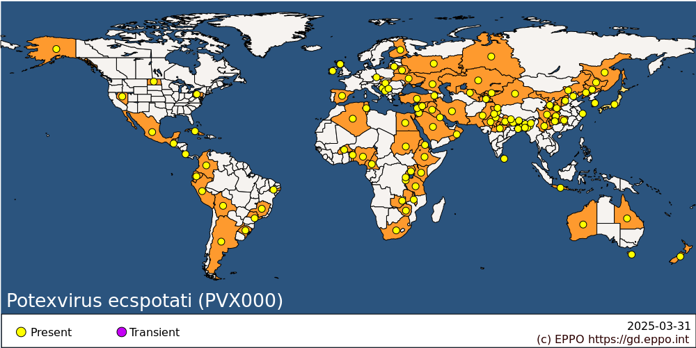 The distribution below covers all isolates, and not only non-European isolates. For details on non-European isolates, see EFSA (2020) Scientific Opinion on the pest categorisation of potato virus X (non-EU isolates). EFSA Journal 18(1), 5937. 36 pp.