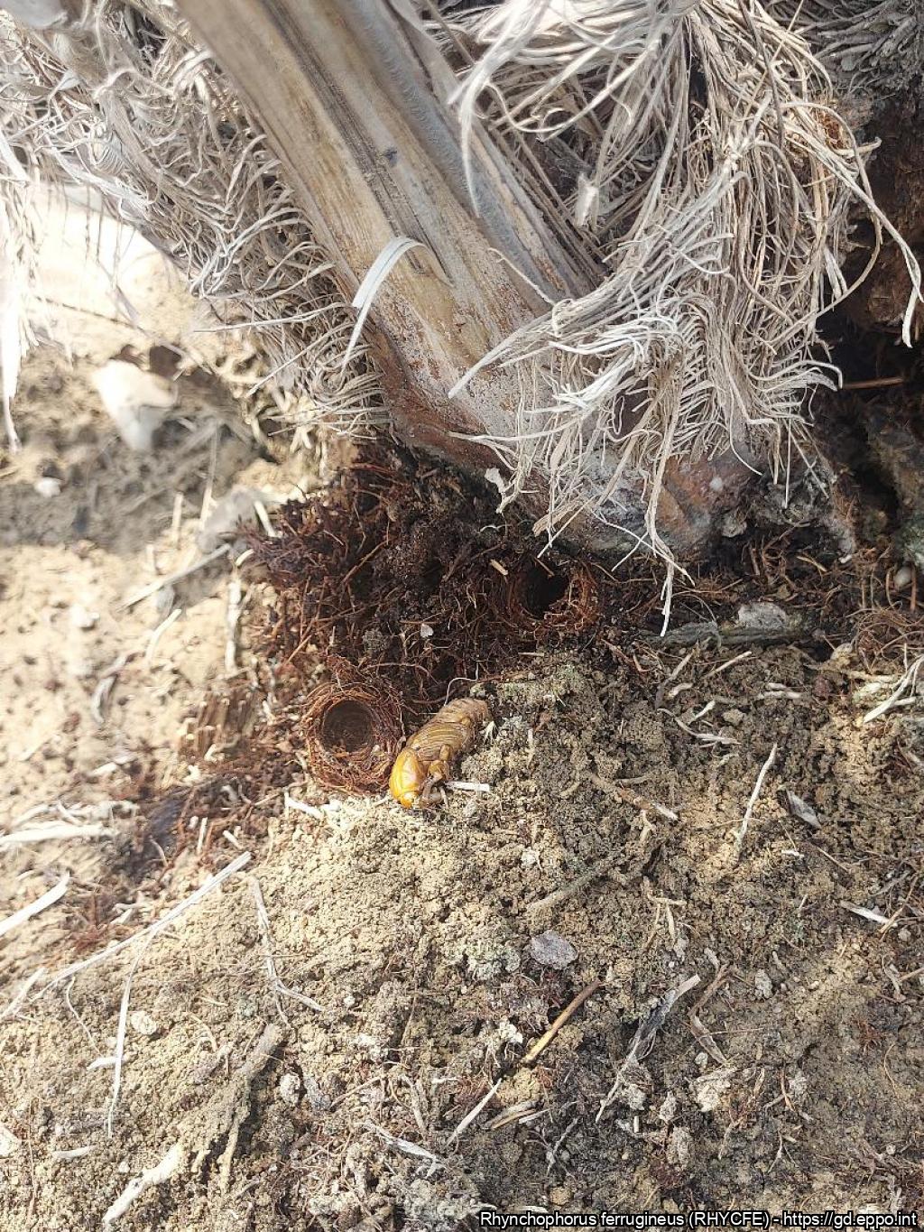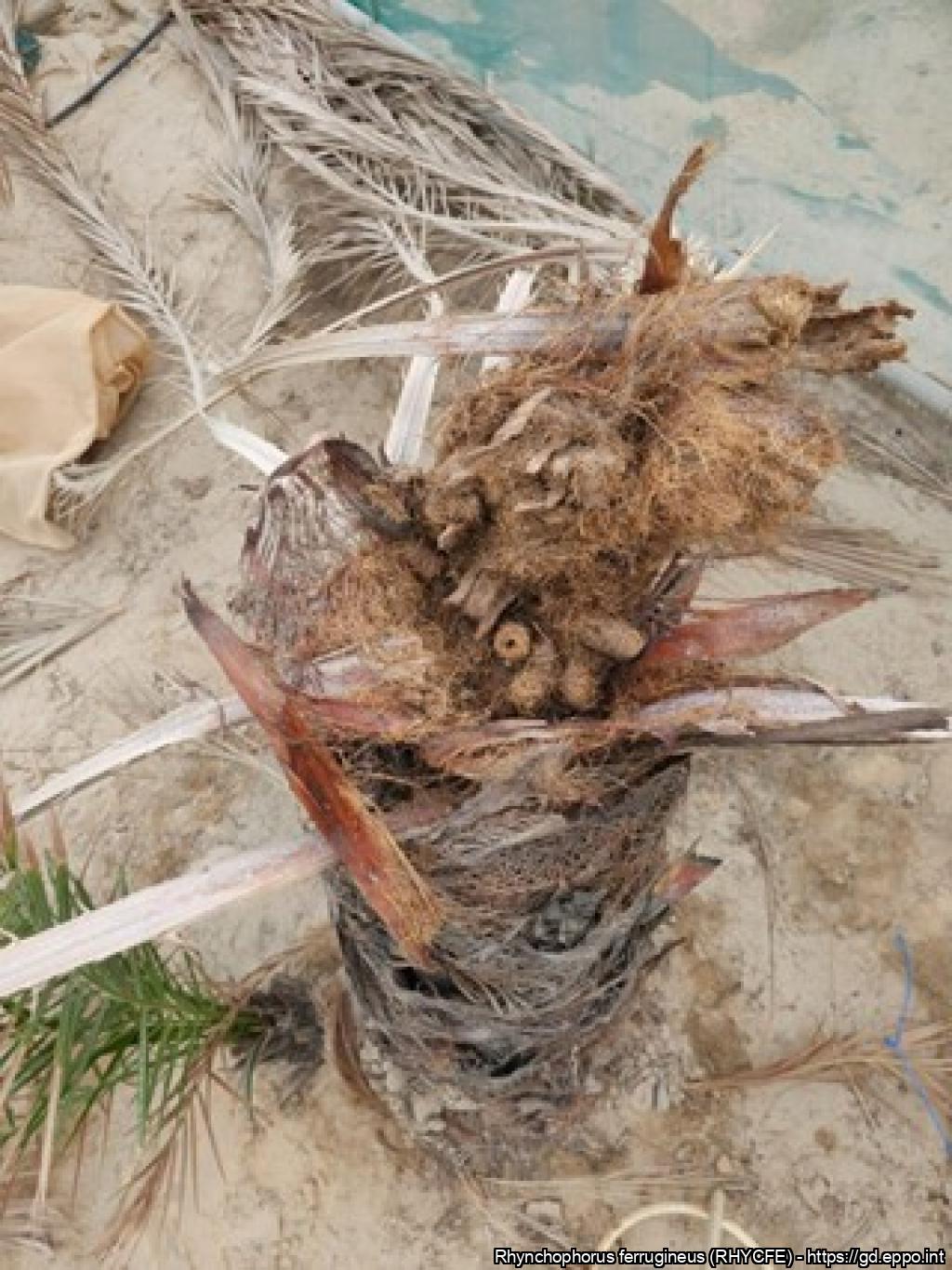 White foam on the trunk signals the early stages of Red Palm Weevil attack.