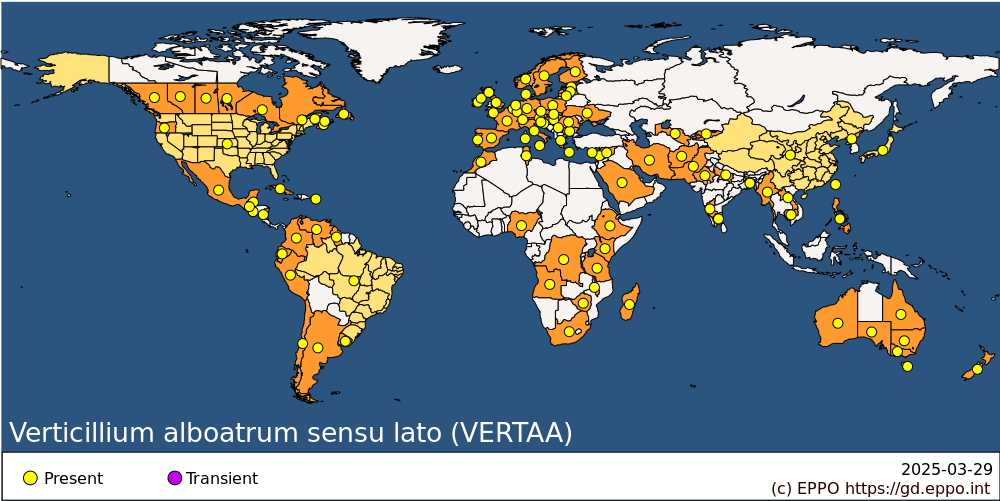 Taxonomic revision (Inderbitzin et al., 2011) has split V. alboatrum sensu lato into 3 species: V. alboatrum sensu stricto, V. alfalfae and V. nonalfalfae. However, the long and complex history of Verticillium species has brought uncertainties in their geographical distribution and host range.
