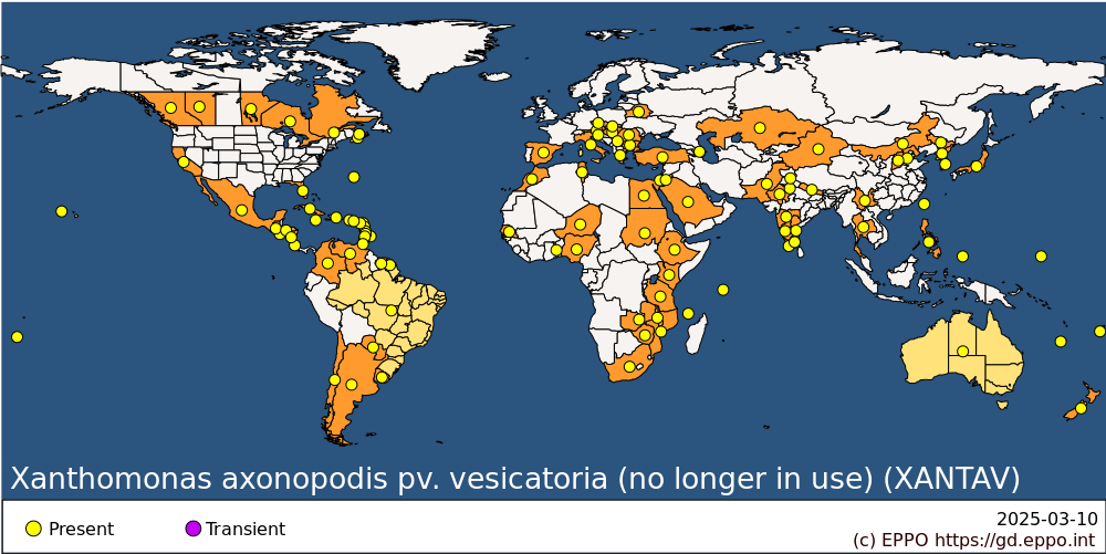 This name is no longer valid. In 2015, EPPO deleted Xanthomonas axonopodis pv. vesicatoria from the A2 list, as taxonomic studies showed that it was in fact different species: Xanthomonas euvesicatoria pv. perforans, Xanthomonas euvesicatoria pv. euvesicatoria, X. hortorum pv. gardneri and X. vesicatoria. However, it is not clear for all countries which species is responsible for bacterial blight of tomato and pepper. The information is maintained in the map for the time being, and maps for individual species are also available.