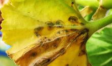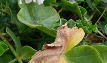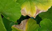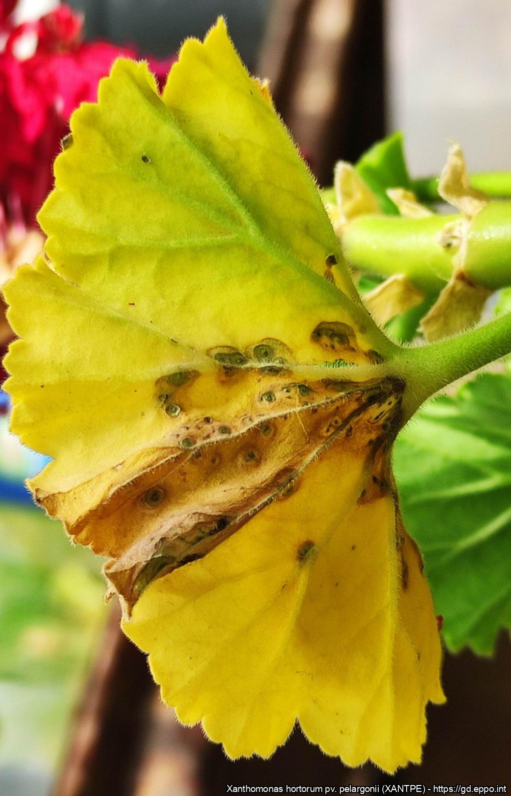 Natural symptoms of bacterial leaf spot of pelargonium caused by Xanthomonas hortorum pv. pelargonii.