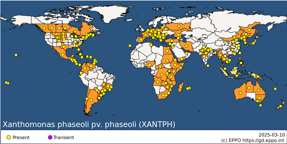 This map shows the distribution of the common blight disease of bean which is currently considered to be caused by two distinct bacteria: X. phaseoli pv. phaseoli and X. citri pv. fuscans (=X. fuscans subsp. fuscans)