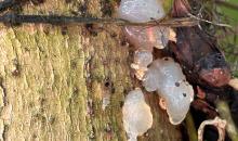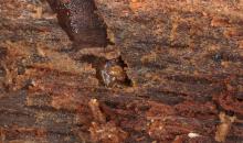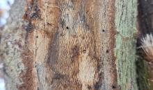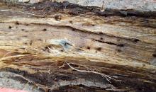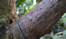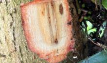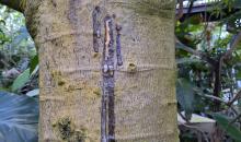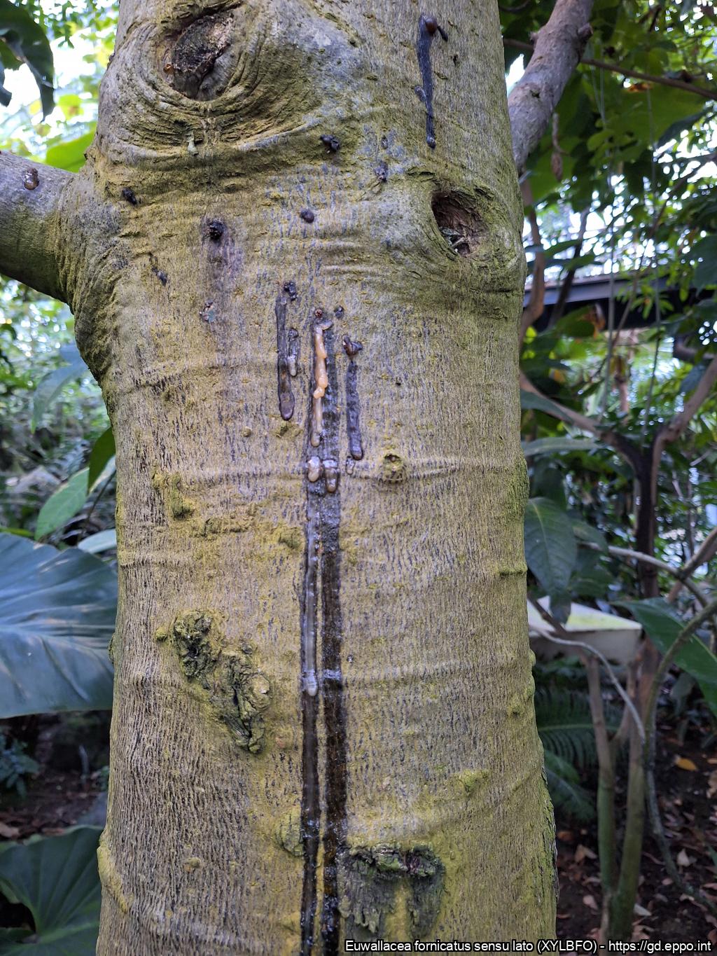 on Sterculia nobilis, trunk with boreholes under the bark and fungus